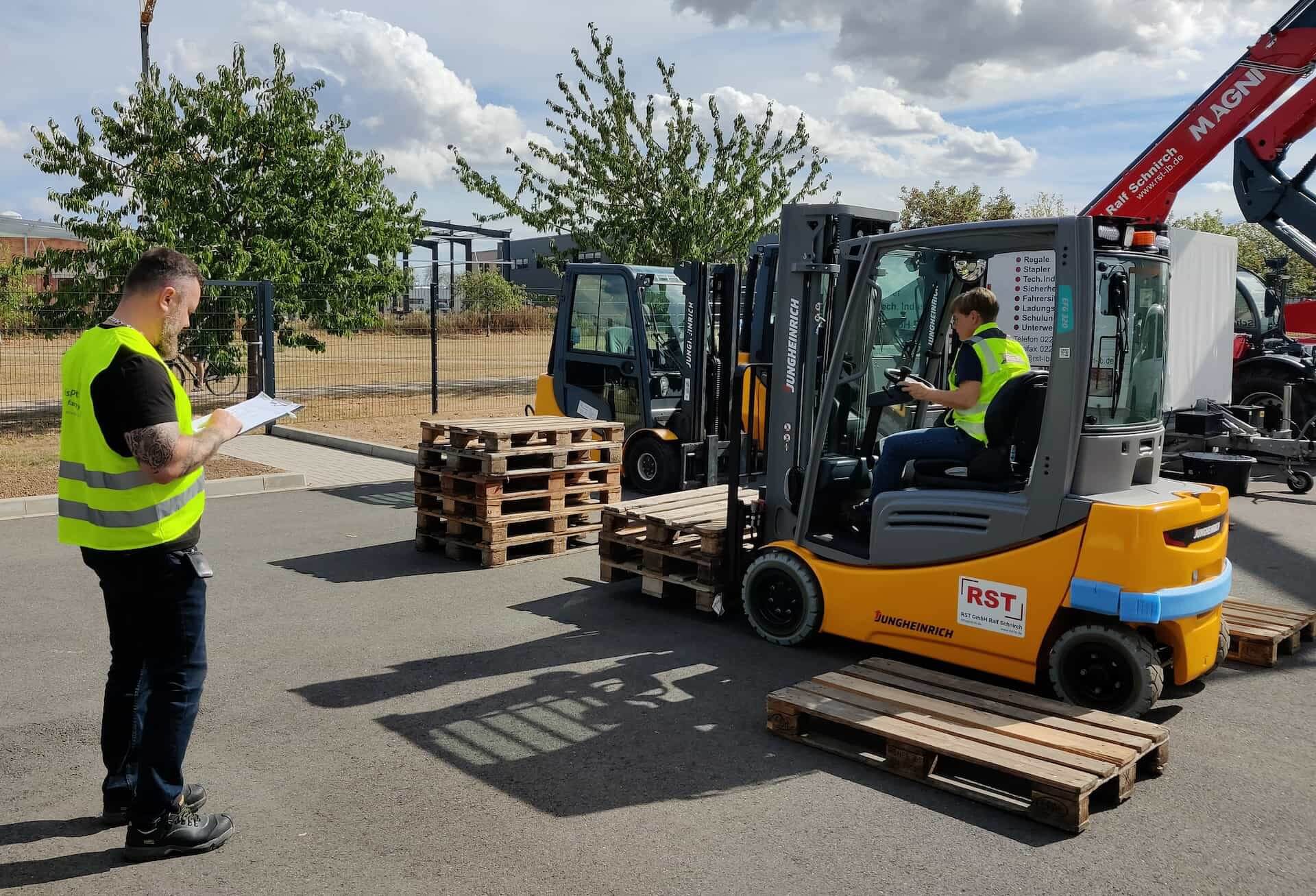 Fahrer benötigen einen gültigen Staplerschein, also eine Ausbildung zum Führen von Flurförderzeugen mit Fahrersitz oder Fahrerstand.