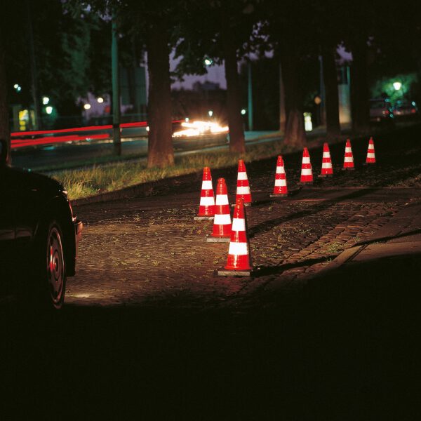 Die Leitkegel sind bei Tag und Nacht durch die voll retroreflektierende Reflexfolie hervorragend sichtbar.