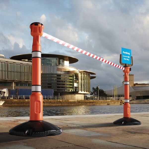Während die Skipper-Gurtkassette auch auf herkömmliche Leitkegel passt, wurde dieser Pfosten für den besonders sicheren Halt konzipiert. Das Oberteil verfügt über eine spezifische Aufnahme, die die Kassette fest fixiert. Mit einer Gesamthöhe von 1.100 mm (inkl. Gurtkassette) befindet sich das Absperrband genau auf der richtigen Sichtachse, um Passanten und Fahrzeuge effektiv zu leiten.