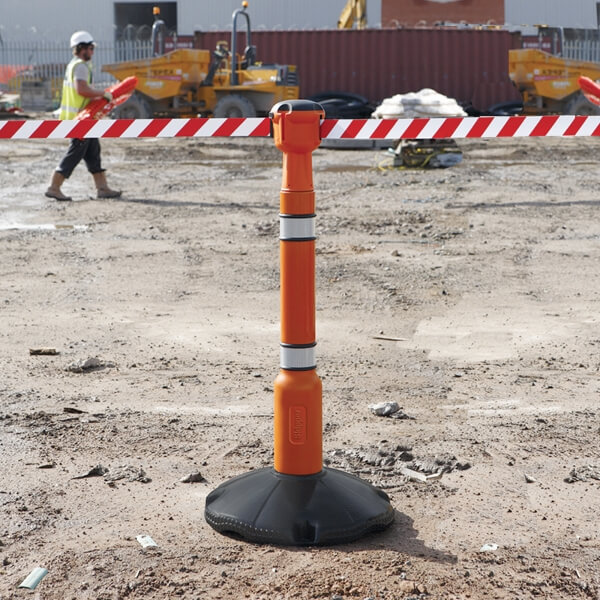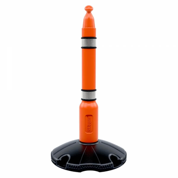 Das leuchtend orangefarbene Oberteil ist mit zwei hochreflektierenden Streifen ausgestattet. Dies garantiert eine exzellente Sichtbarkeit bei Tag und Nacht. Der verwendete Kunststoff ist robust, witterungsbeständig und leicht zu reinigen, was den Pfosten zu einem langlebigen Begleiter für mobile Absperrungen macht.