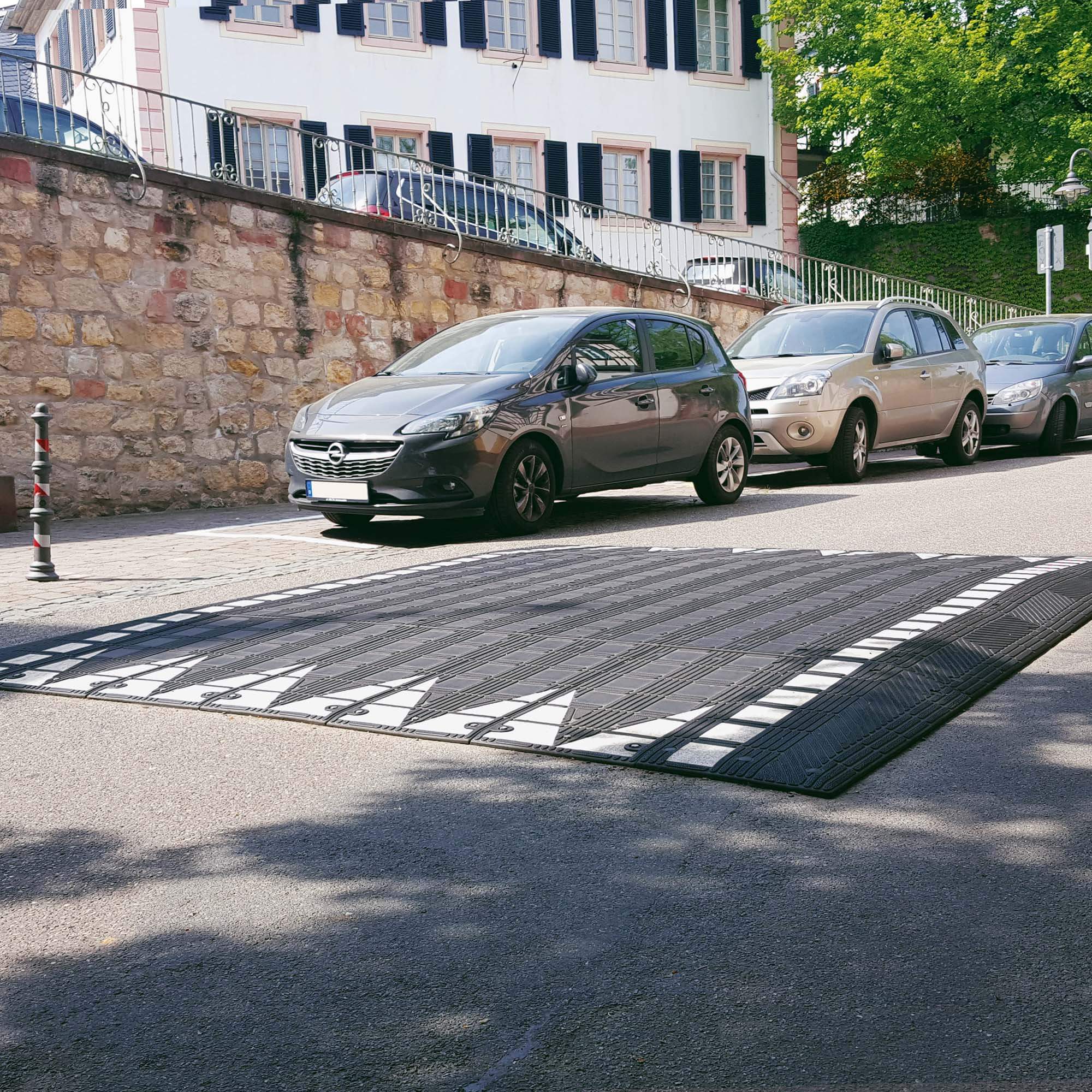 Die bewusst konstruierten Rampenneigungen sorgen für eine kontrollierte fahrdynamische Wirkung: Während die Front- und Abschlusselemente mit einer flachen Steigung von 1:15 ein sanftes Überfahren ermöglichen, verhindern die steileren seitlichen Elemente mit einer Neigung von 1:3 ein Ausweichen über den Randbereich. Dadurch wird der Verkehrsfluss gezielt verlangsamt, ohne unnötige Erschütterungen oder Lärmbelastungen zu verursachen.