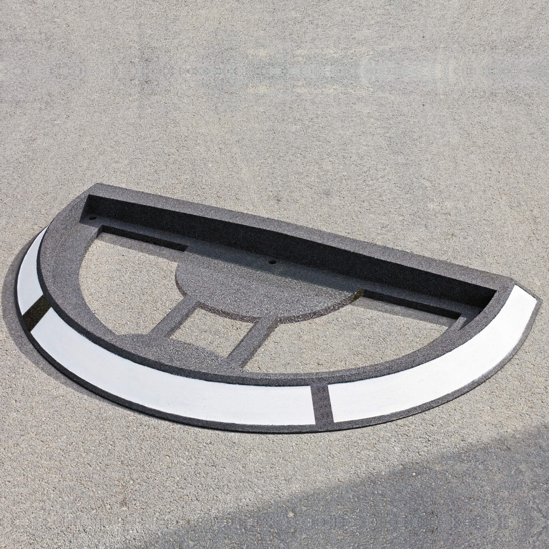 Die halbkreisförmige Verkehrsinsel ist modular aufgebaut und besteht aus sortenreinem Gummigranulat. Dieses Material absorbiert Aufprallkräfte besser als starre Materialien aus Beton oder Kunststoff. Dadurch wird sowohl die Insel als auch die Fahrzeuge im Falle eines Anfahrens geschützt.