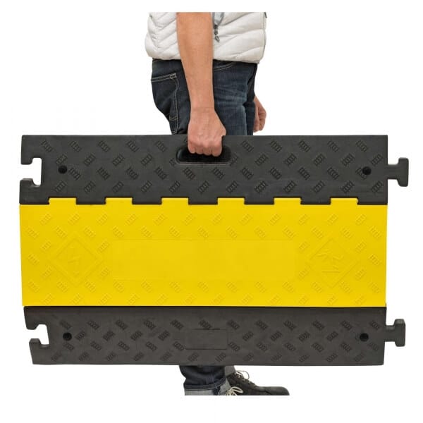 Für maximale Sicherheit sorgt der auffällige gelbe Deckel aus robustem Kunststoff, der eine starke Warn- und Signalwirkung erzielt. Die geriffelte, rutschhemmende Oberfläche reduziert die Rutschgefahr erheblich, selbst bei Nässe, Schmutz oder Schnee. Gleichzeitig schützt die Überfahrhöhe von 75 mm die eingelegten Kabel und Schläuche zuverlässig vor Quetschungen.