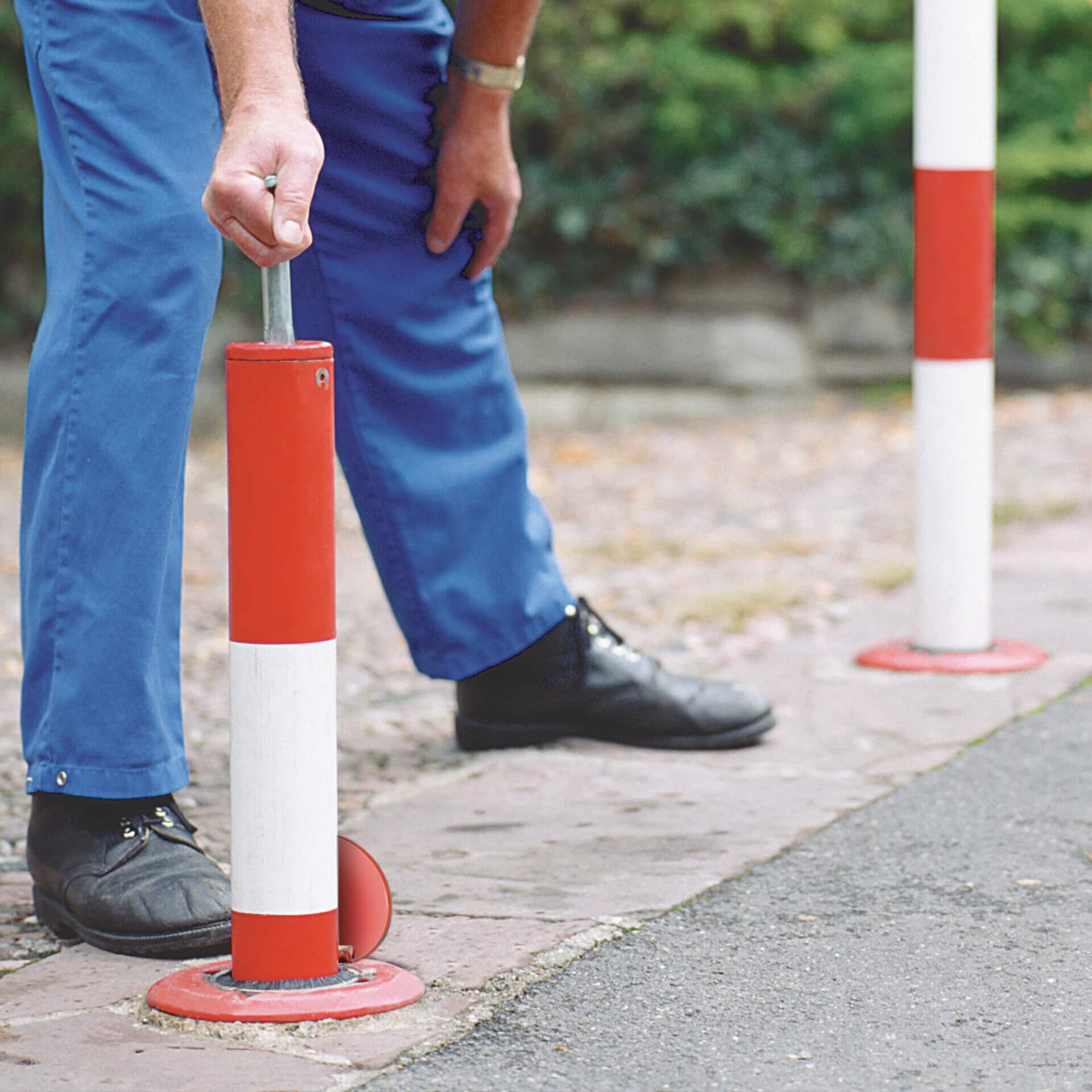 halbautomatisch versenkbarer Sperrpfosten aus Gütestahl, feuerverzinkt und rot-weiß beschichtet