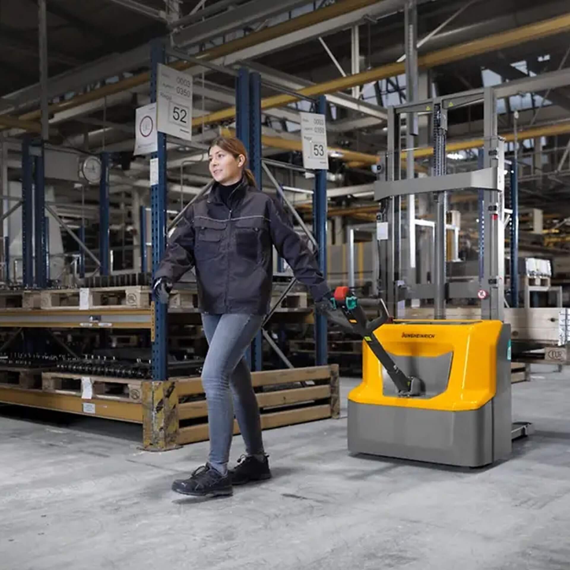 Ob gelegentliche Lastentransporte oder effizientes Ein- und Auslagern – die flexiblen und wendigen Elektro-Deichselstapler der Baureihe AMC 12 sind als zuverlässige Einstiegsmodelle in das elektrische Hochhubwagen-Segment die ideale Ergänzung für Ihr tägliches Palettenhandling. Wartungsfreie Lithium-Ionen-Batterien mit integriertem Ladegerät bieten dank zeitsparender Ladeprozesse und frei wählbarer Ladestandorte maximale Flexibilität. Für Sicherheit sorgt das Jungheinrich Assistenzsystem Curve Control, indem es die Geschwindigkeit in Kurven automatisch reduziert. Der beidhändig und intuitiv bedienbare Multifunktions-Deichselkopf ermöglicht in Kombination mit dem Schleichfahrttaster sicheres, verlangsamtes Rangieren mit hochgestellter Deichsel – für gesteigerte Manövrierfähigkeit in beengten Bereichen.