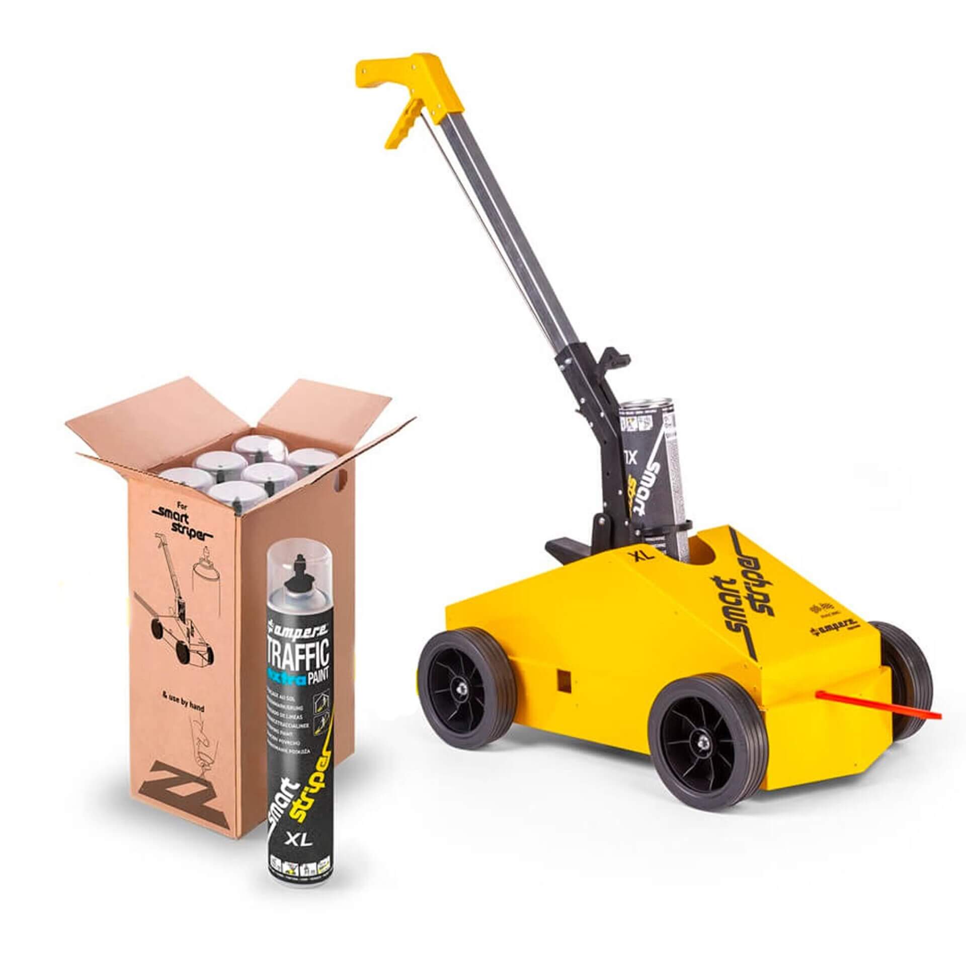 Bodenmarkierungsset bestehend aus einem Bodenmarkiergerät und einem Karton Sprühfarbe.