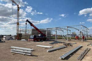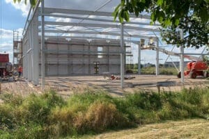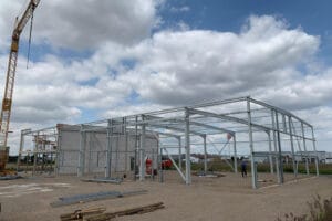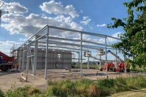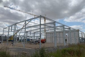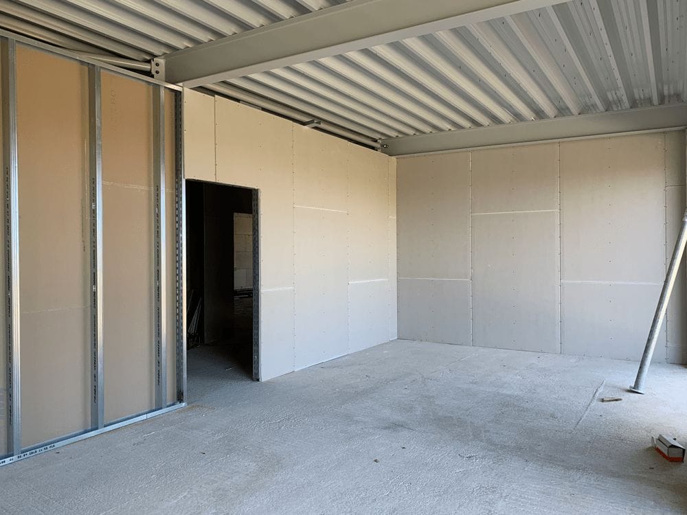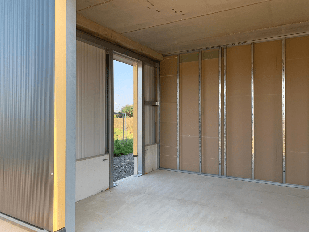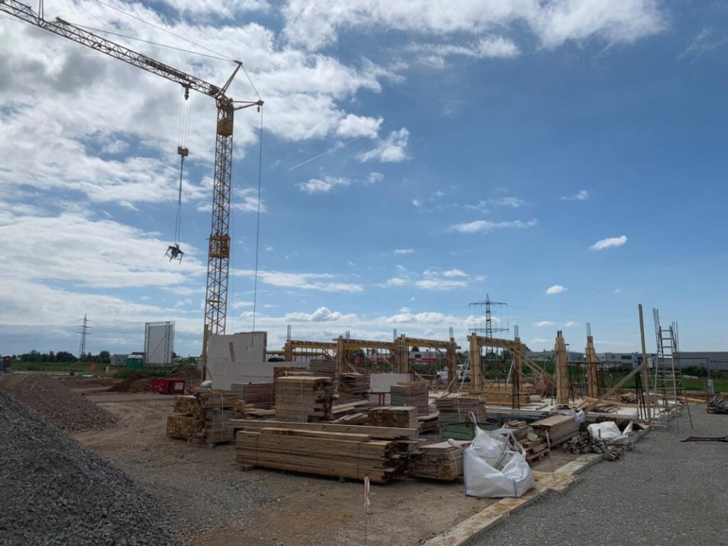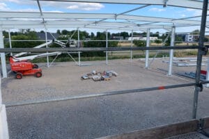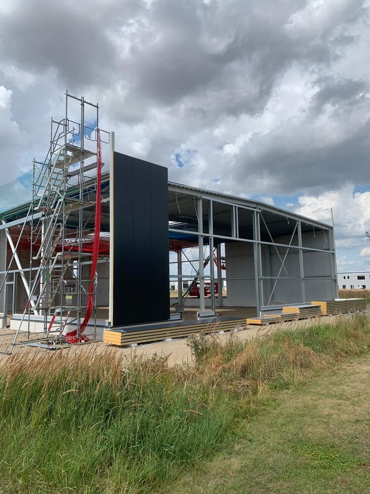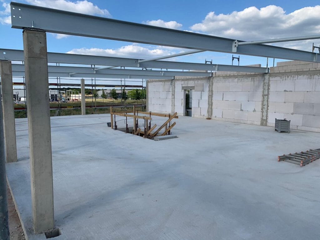 Ende Juni fanden die ersten Arbeiten für den Aufbau der Stahlhalle / Lagerhalle statt. Gleichzeitig wurden die letzten Ausschalarbeiten und Restarbeiten im Büro fertiggestellt.