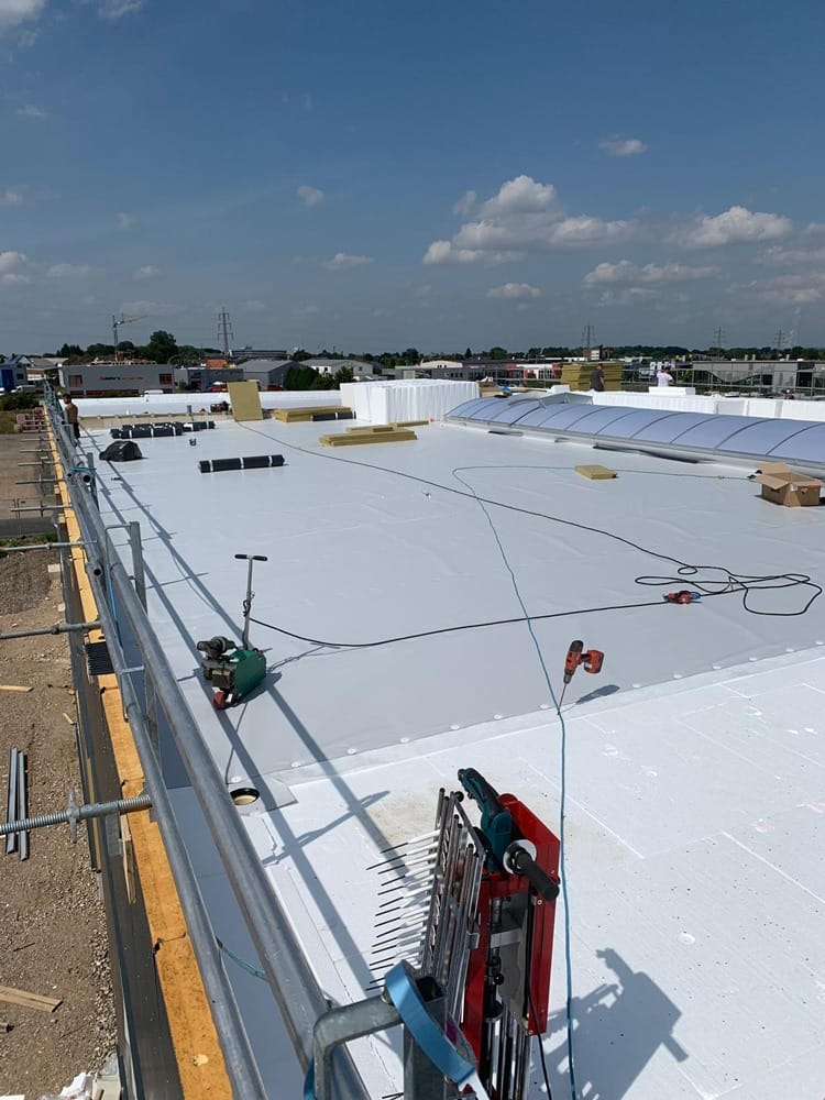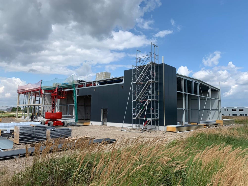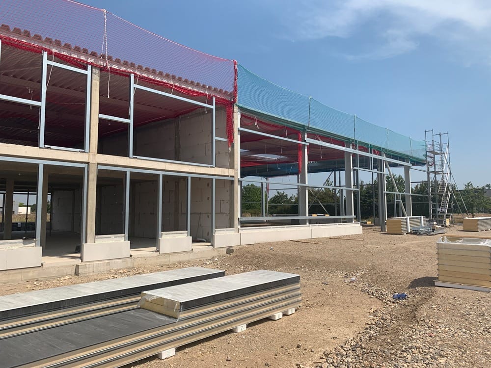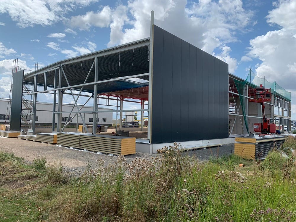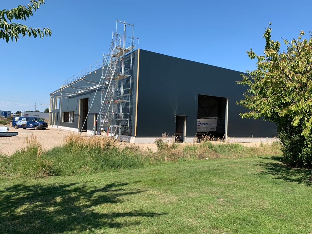 Bei glühender Hitze und Temperaturen von teilweise 42°C wurde fleißig an unserer neuen Firma weitergearbeitet. In frühen Morgenstunden wurden die Dach- und Wandelemente geliefert und bereits teilweise angebracht. In der Lagerhalle ist der Lichtstreifen mittig in der Decke erkennbar und zeigt, dass bei den Planungen auch dort Wert auf Tageslicht gelegt wurde.