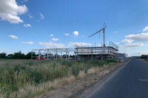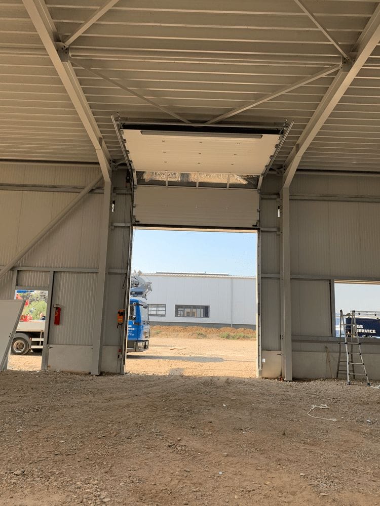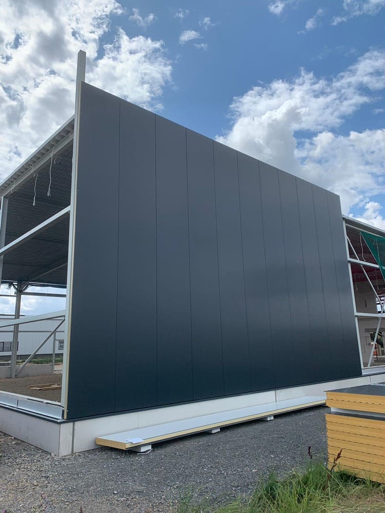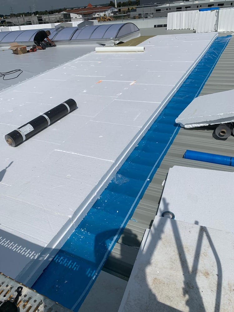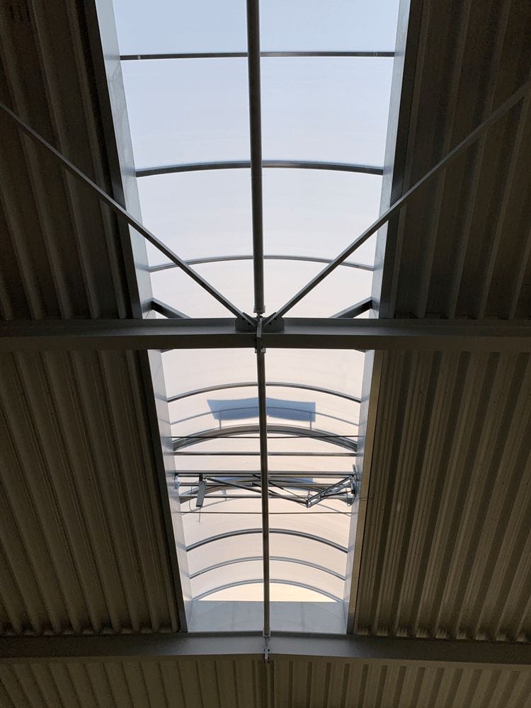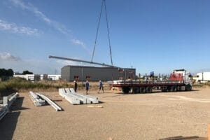 Bei glühender Hitze und Temperaturen von teilweise 42°C wurde fleißig an unserer neuen Firma weitergearbeitet. In frühen Morgenstunden wurden die Dach- und Wandelemente geliefert und bereits teilweise angebracht. In der Lagerhalle ist der Lichtstreifen mittig in der Decke erkennbar und zeigt, dass bei den Planungen auch dort Wert auf Tageslicht gelegt wurde.
