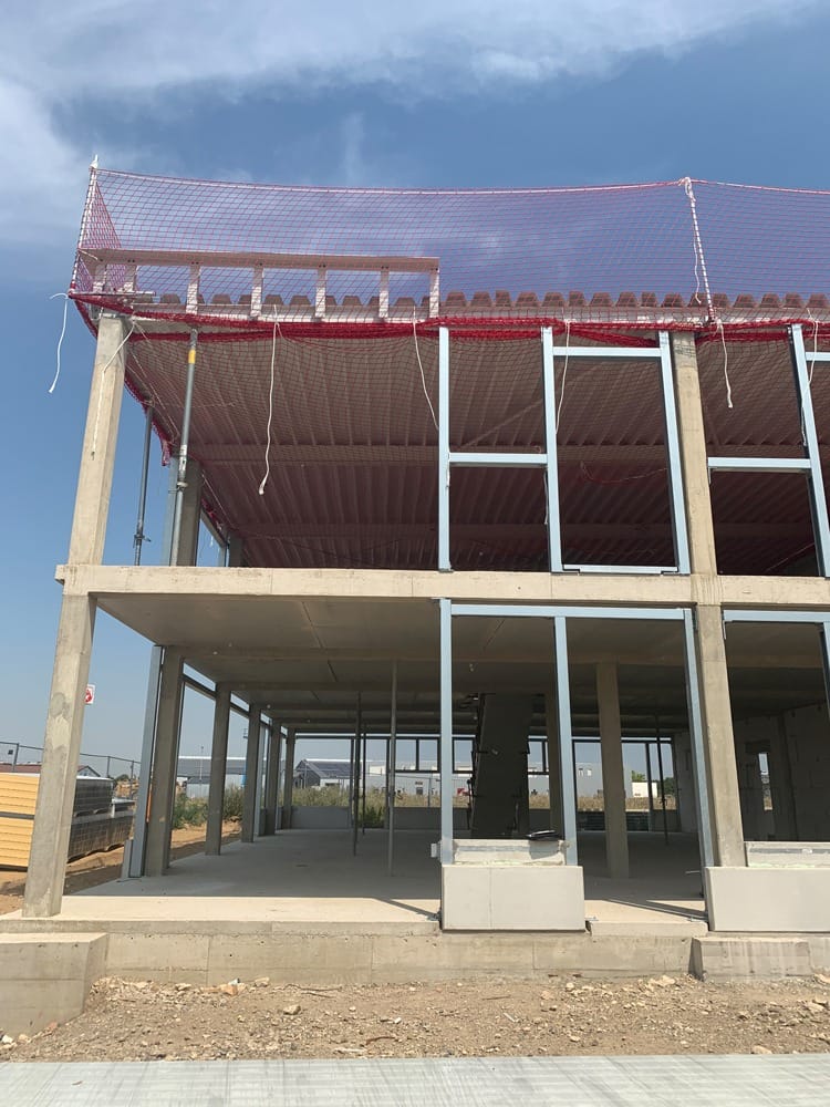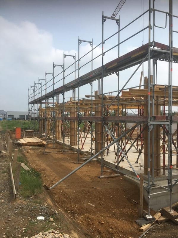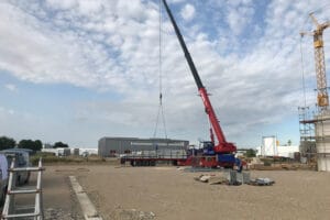 Es benötigte eine Weile, bis die Stützen endgültig ausgehärtet waren, bevor die Halle / das Büro sowie der Treppenturm und die Randabsturzsicherung für weitere Arbeiten eingenetzt wurden.