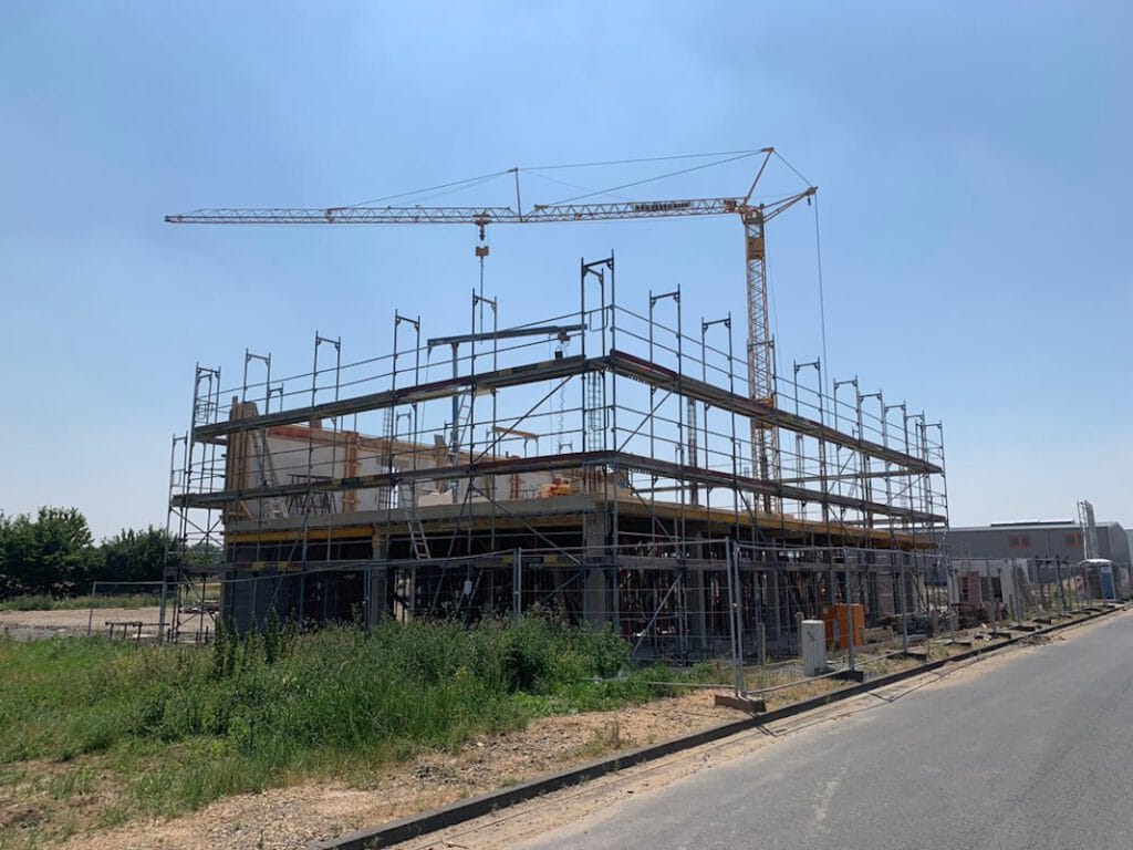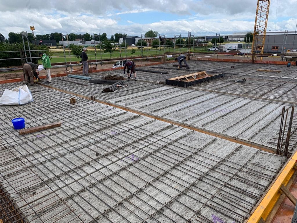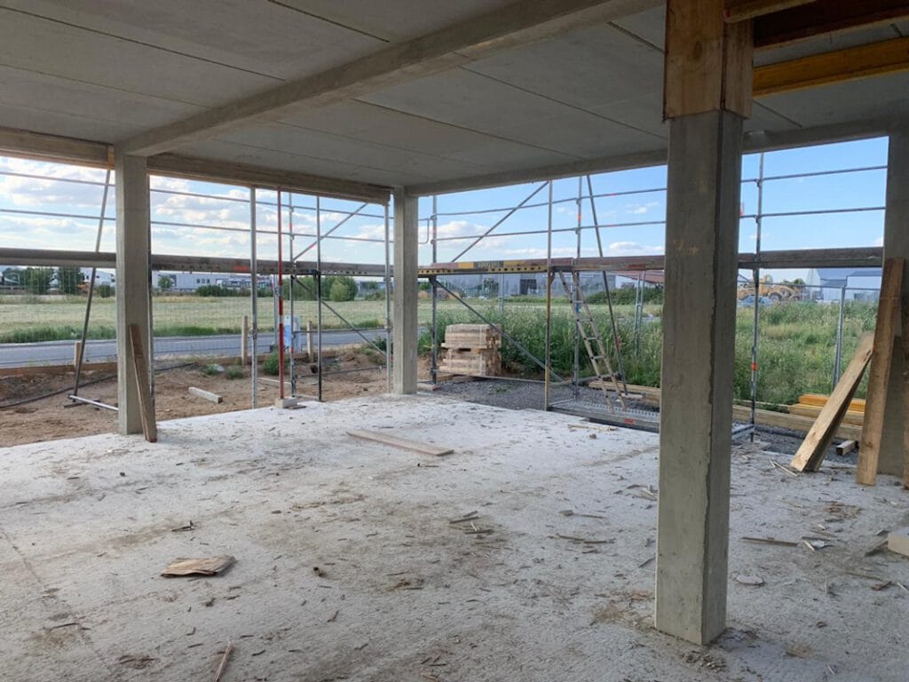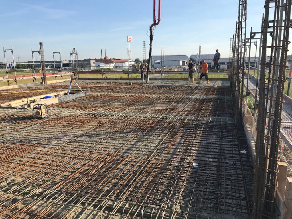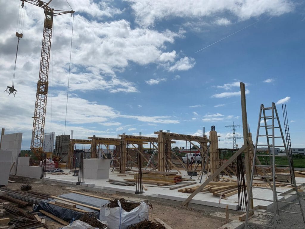 Nachdem die Bodenplatte im Bürobereich gegossen wurde, fanden die Schal- und Bewehrungsarbeiten für die ersten Stützen sowie der Unterzüge statt. Zusätzlich wurde die Mauerwerkswand im Erdgeschoss fertiggestellt.