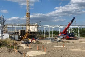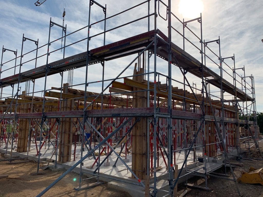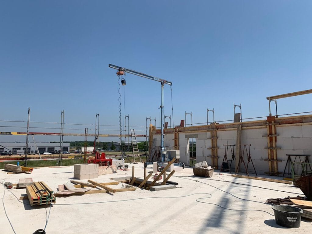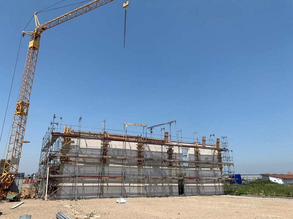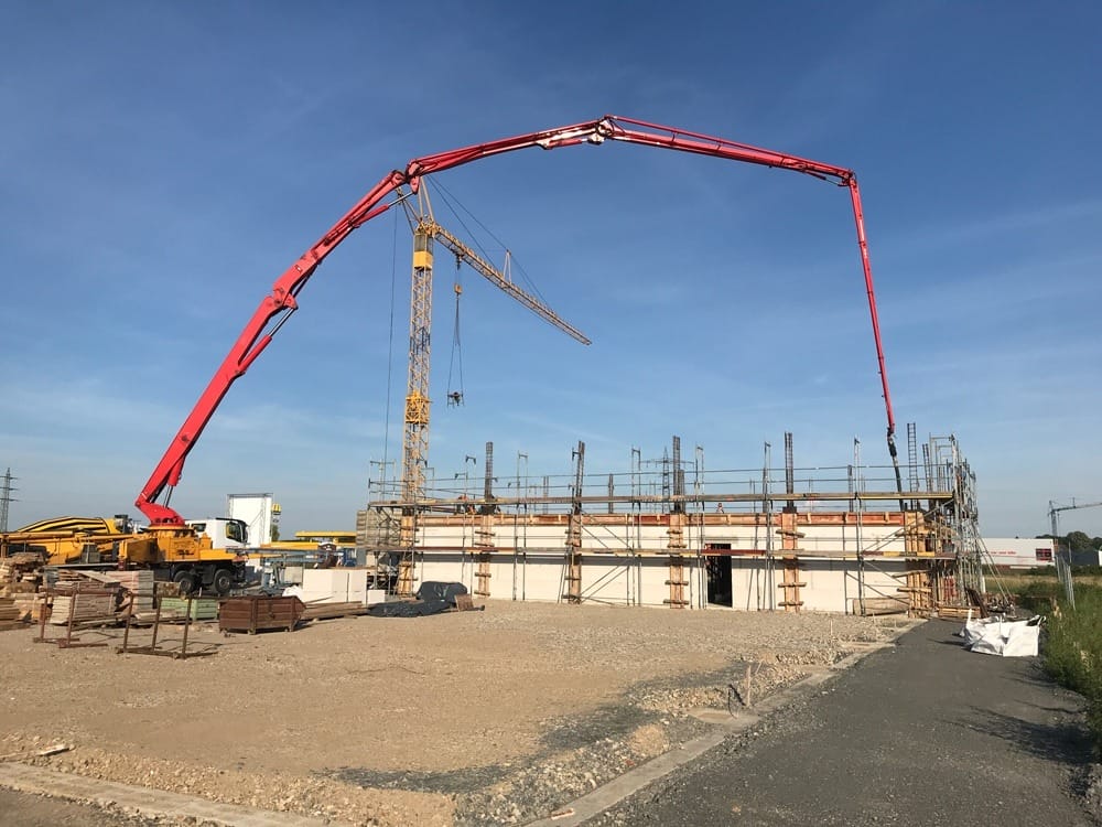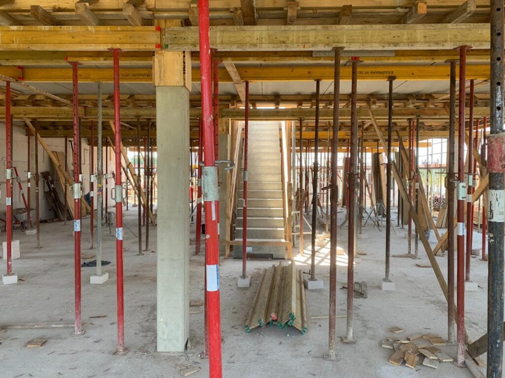 Nachdem die Bodenplatte im Bürobereich gegossen wurde, fanden die Schal- und Bewehrungsarbeiten für die ersten Stützen sowie der Unterzüge statt. Zusätzlich wurde die Mauerwerkswand im Erdgeschoss fertiggestellt.