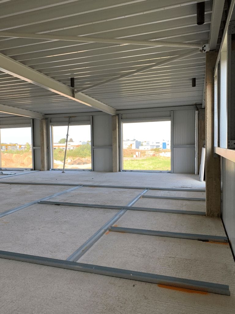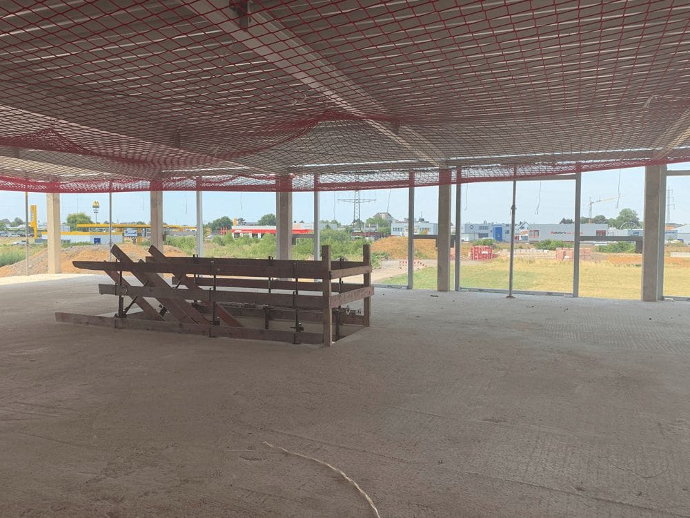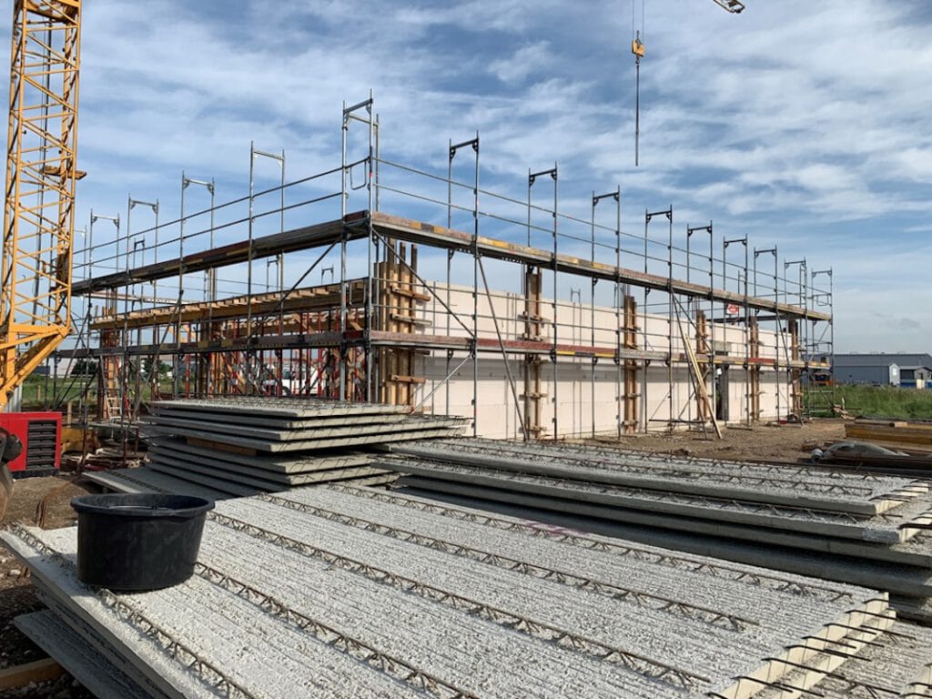 Im nächsten Schritt wurde die Filigrandecke gelegt sowie diese und die aufgehenden Stützen bewehrt. Es erfolgte ebenfalls das Einmessen der Achsen für den Stahlbau im Hallenbereich.