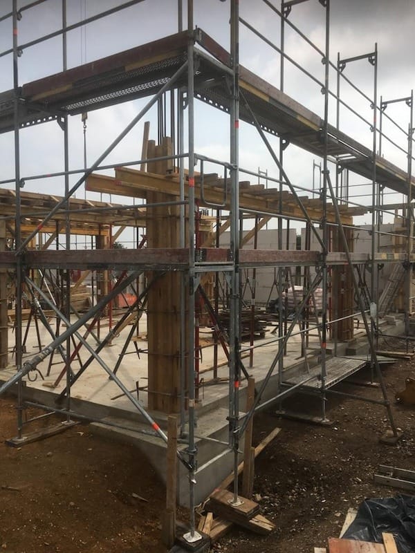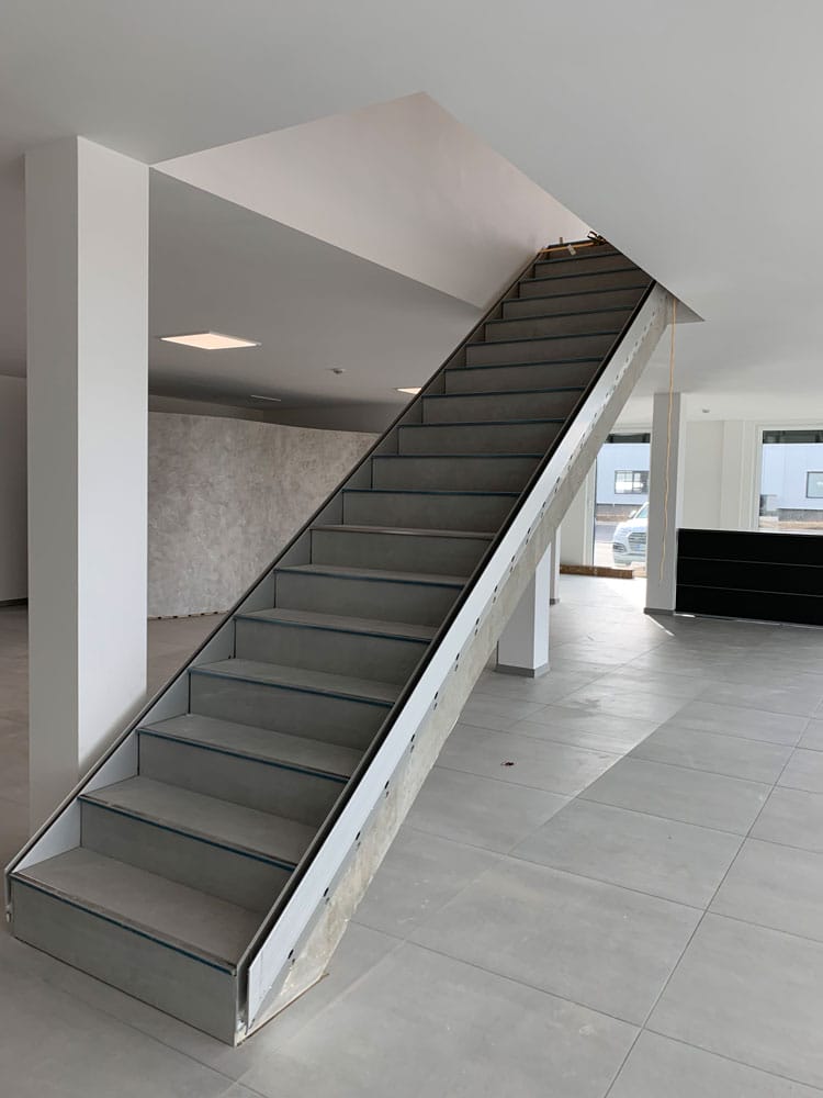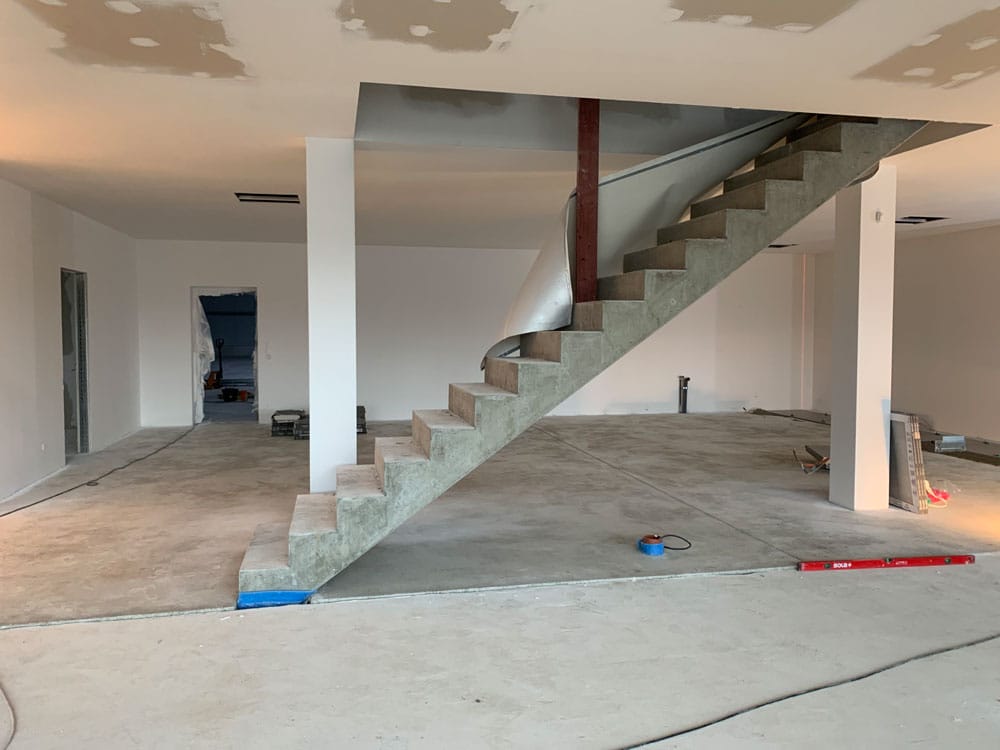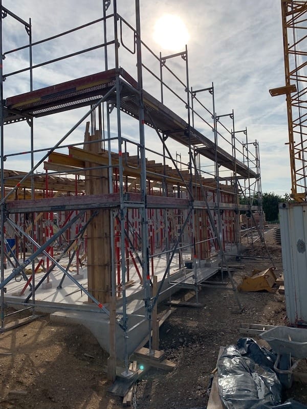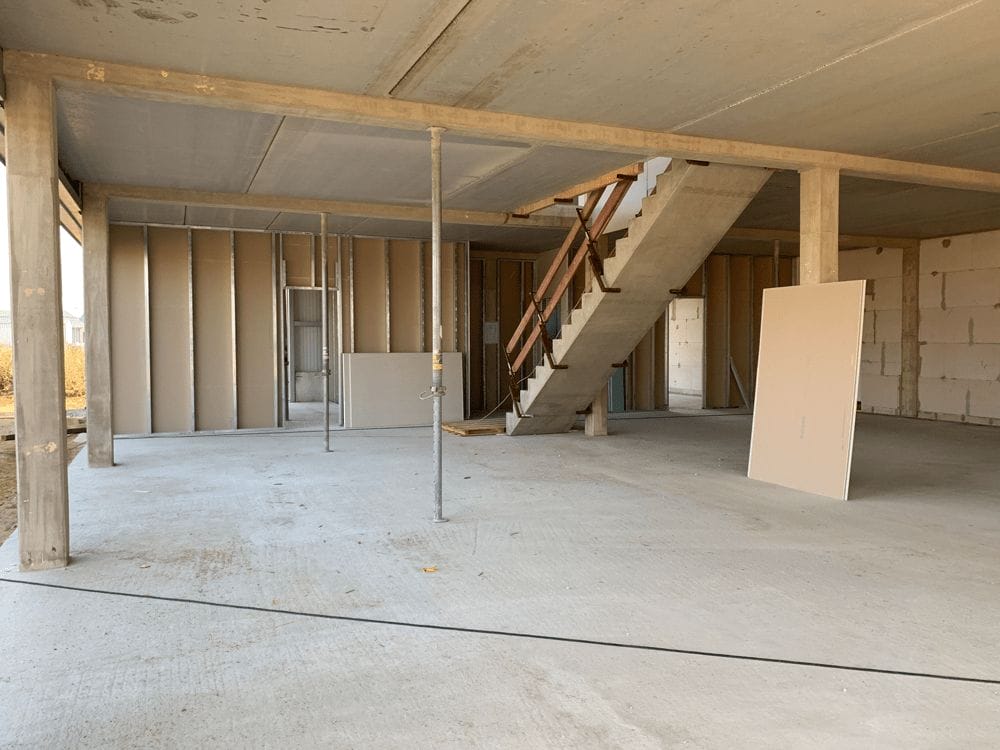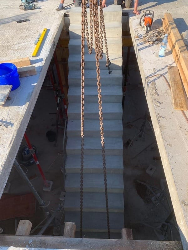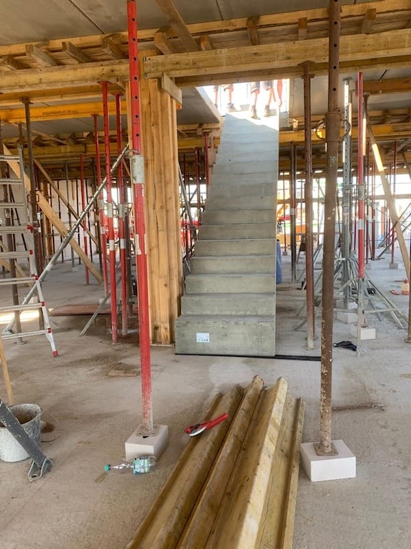 Zusätzlich wurde die Treppe geliefert und montiert. Die Treppe wurde parallel zu den bisherigen Arbeiten angefertig und konnte somit als Fertigteil eingestzt werden. Des Weiteren erfolgen Schalenarbeiten für die Stützen der ersten Etage. Des Weiteren erfolgte die Erstellung der Mauerwerkswand, sowie die Einschalarbeiten der Stützen.