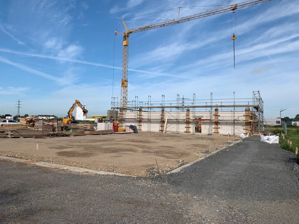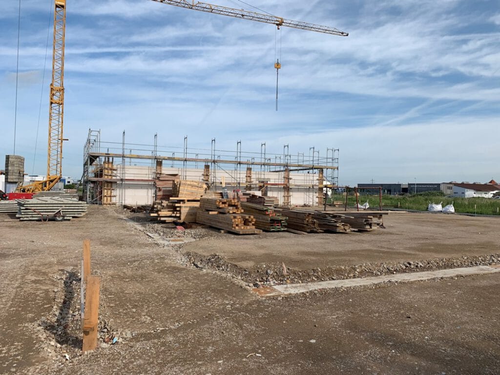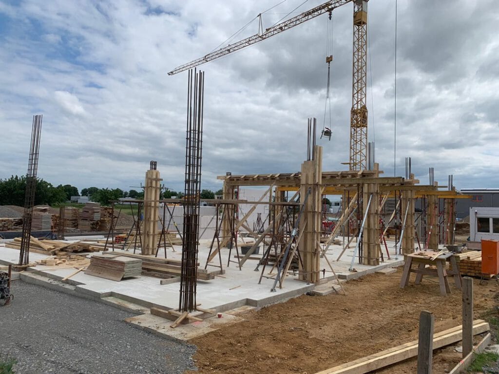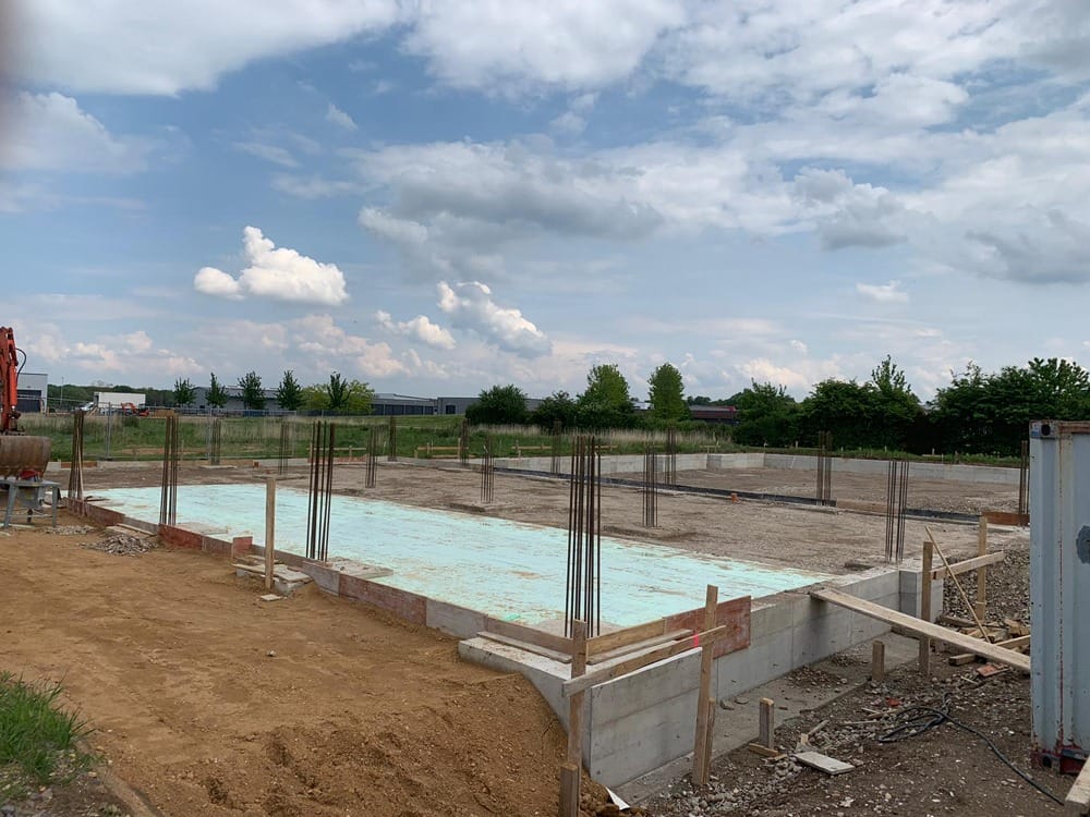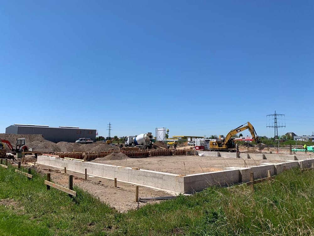 Seit dem Spartenstich ist viel passiert.. Der Bau unseres neuen Firmensitzes startete mit den Fundamenten. Hierzu wurden zu Beginn Schalarbeiten durchgeführt, gefolgt von der Betonage des ersten Abschnitts. Der Bürobereich wurde innen und außen verfüllt. Danach erfolgte die Betonage des hinteren Abschnitts, der die Lagerhalle umfasst. Neben der innenliegenden Entwässerung erfolgte ebenfalls die Betonage der Bodenplatte sowie die Schalarbeiten für die Stützen im Büroabschnitt.