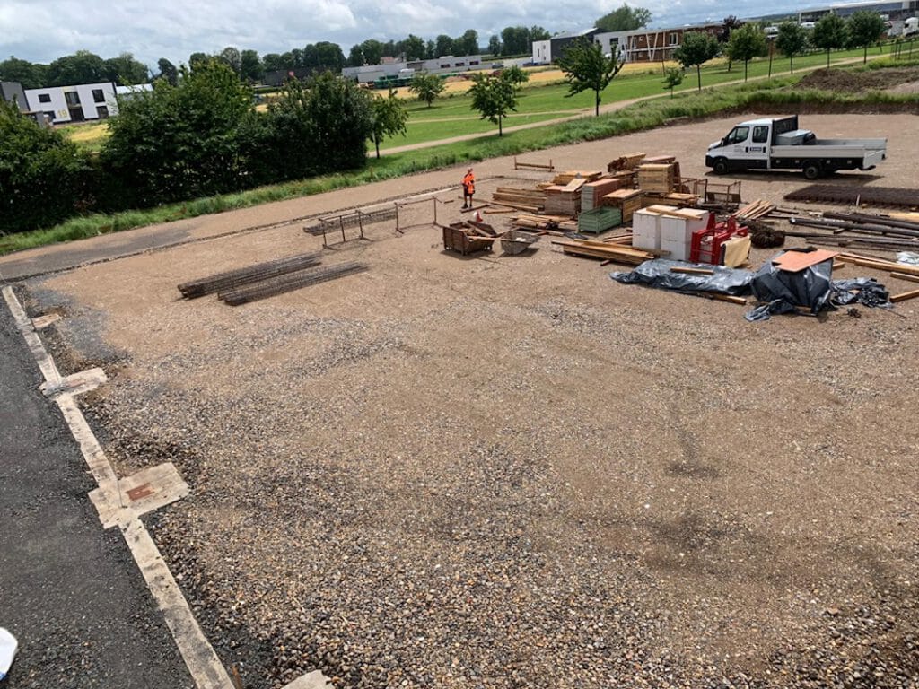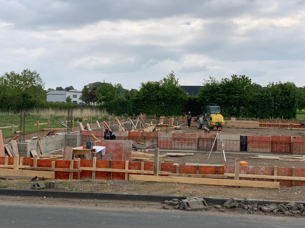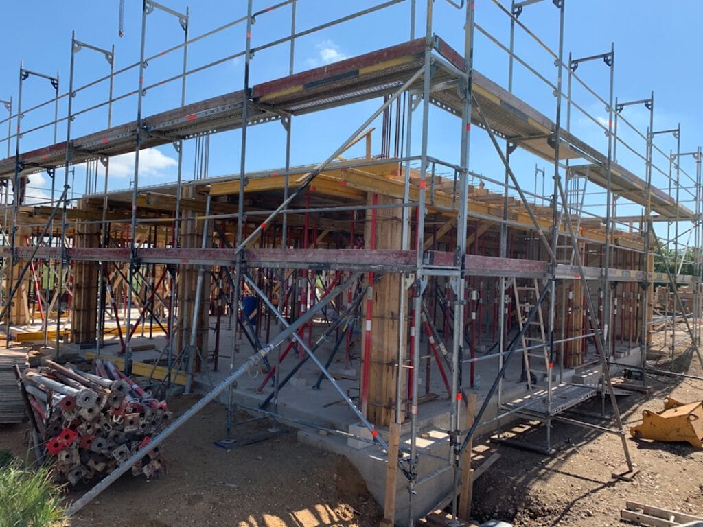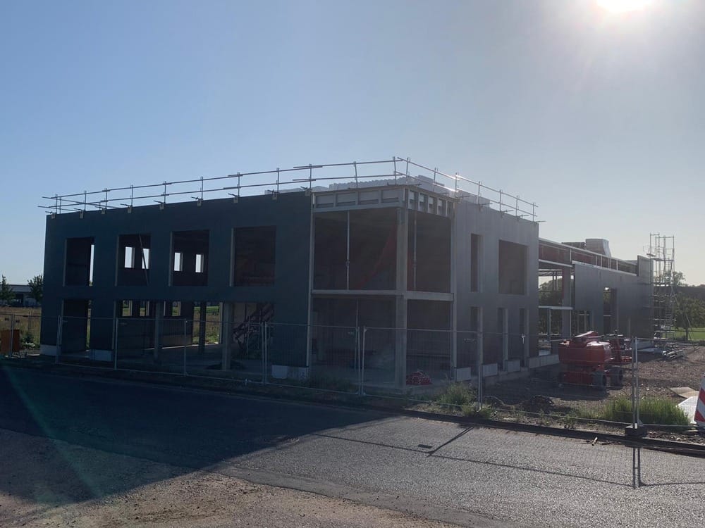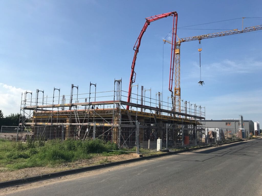Seit dem Spartenstich ist viel passiert.. Der Bau unseres neuen Firmensitzes startete mit den Fundamenten. Hierzu wurden zu Beginn Schalarbeiten durchgeführt, gefolgt von der Betonage des ersten Abschnitts. Der Bürobereich wurde innen und außen verfüllt. Danach erfolgte die Betonage des hinteren Abschnitts, der die Lagerhalle umfasst. Neben der innenliegenden Entwässerung erfolgte ebenfalls die Betonage der Bodenplatte sowie die Schalarbeiten für die Stützen im Büroabschnitt.